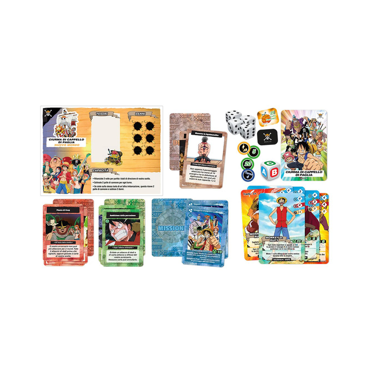 1 Tabellone di gioco, 8 Dadi, 13 Carte Nave, 154 Carte Ciurma Principale, 119 Carte isolani, 50 Carte Evento, 27 Carte Log Pose, 40 Carte Attacco, 30 Carte Difesa, 30 Carte Svantaggio, 26 Carte Missione, 80 Gettoni Vittoria, 20 Gettoni Cannone, 76 Gettoni Danno, 22 Gettoni Log Pose, 84 Bandierine, 28 Gettoni Isola, 15 Pedine Veliero, 1 Regolamento